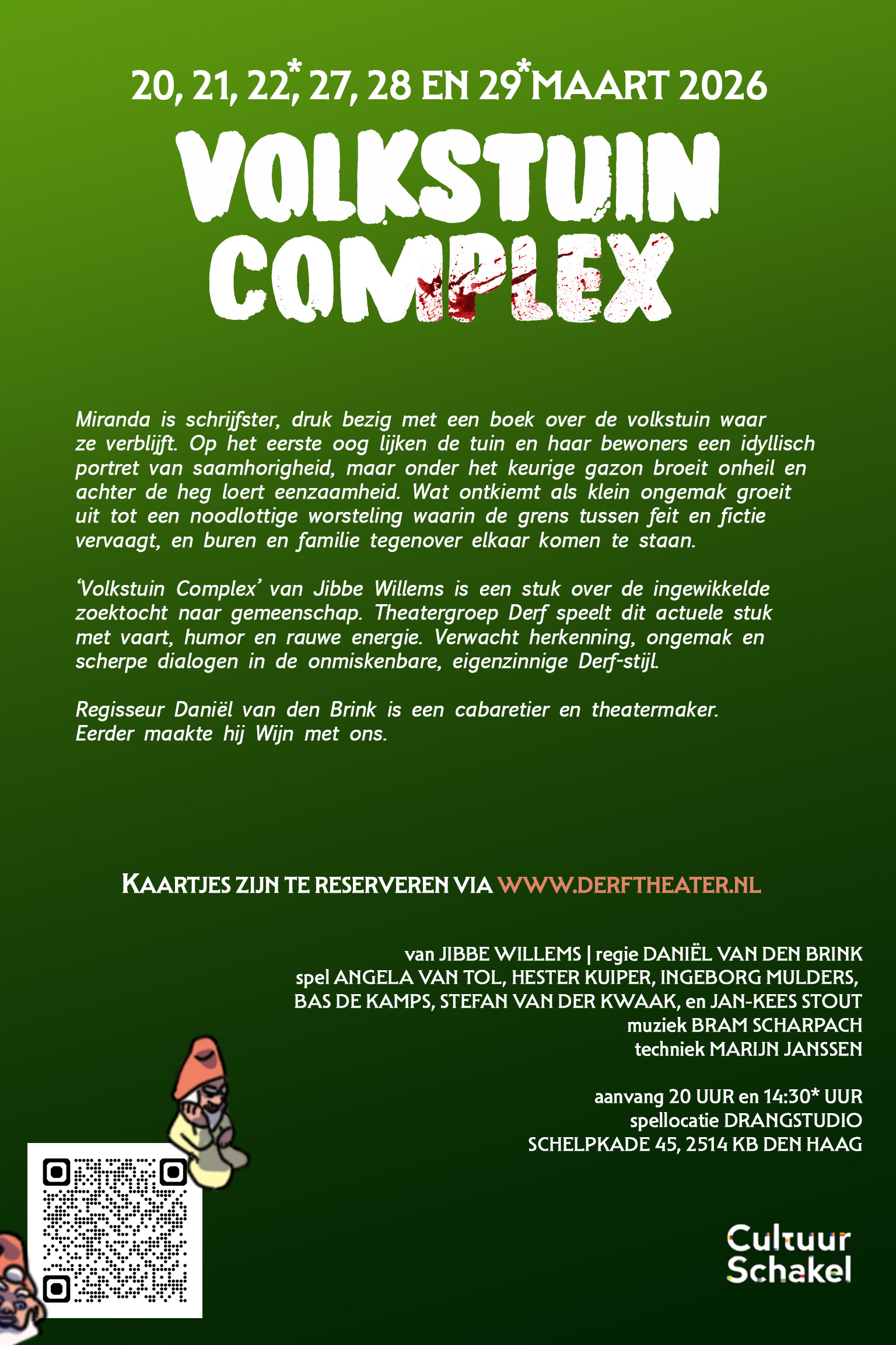 ‘Volkstuin Complex’ van Jibbe Willems is een stuk over de ingewikkelde zoektocht naar gemeenschap. Theatergroep Derf speelt dit actuele stuk met vaart, humor en rauwe energie. Verwacht herkenning, ongemak en scherpe dialogen in de onmiskenbare, eigenzinnige Derf-stijl.